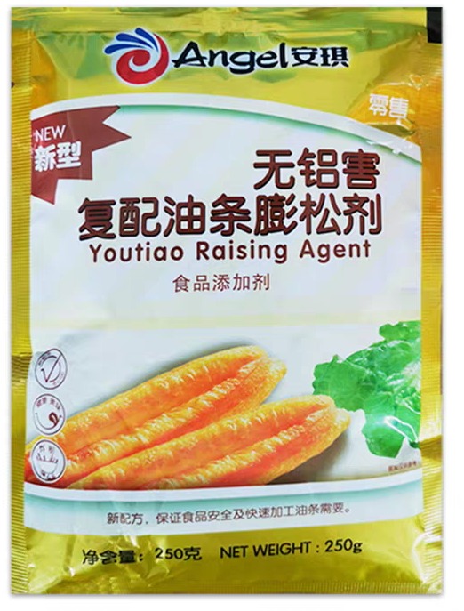250g Packet of Angel Brand Youtiao Raising Agent (复配油条膨松剂). This aluminum-free compound leavening agent is specifically formulated to produce the authentic, crispy, and fluffy texture of traditional Chinese Youtiao (Chinese Cruller/Dough Fritter).