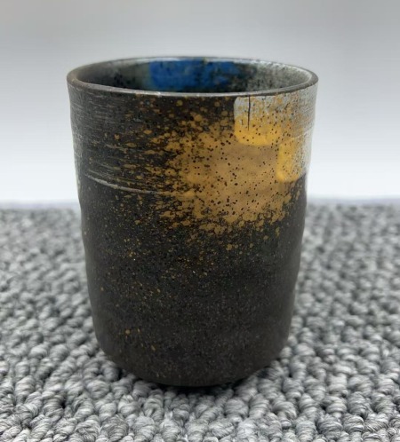 Artisan Ceramic Tea Glass (Small) with a dark, textured base and an irregular glaze pattern featuring speckles of metallic gold/yellow and a hint of bright blue near the rim.