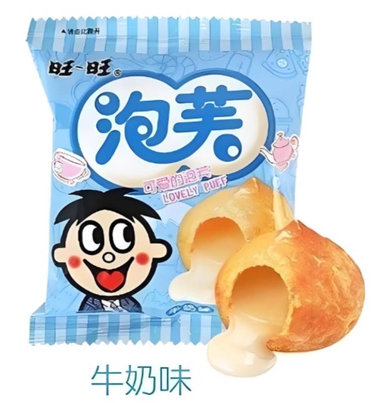 A package of Wang Wang Lovely Puff (泡芙 – Pào Fú) in the Milk Flavor (牛奶味). This snack consists of crispy puffed shells filled with a creamy, white milk-flavored filling.
