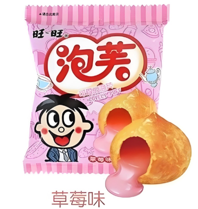 A packet of Wang Wang Pao Fu (旺旺 泡芙), or Lovely Puff. These are light, airy puff snacks with a creamy, sweet strawberry flavor (草莓味) filling.