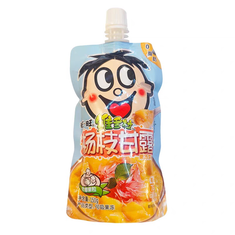 A 150g squeeze pouch of Wang Wang Vita-Granule Fruit Jelly (旺旺 维多粒 果冻爽). This is a thick, fruit-flavored jelly, possibly containing small fruit pulp or granules (含果粒), with a sweet Peach flavor (桃子味).
