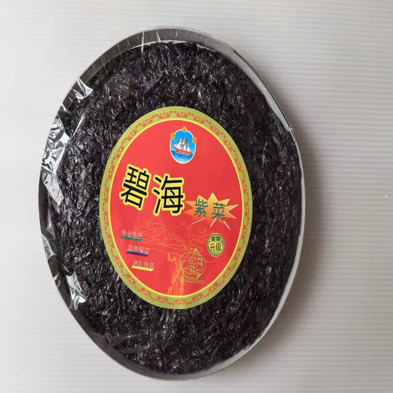 A package of high-quality Dried Laver (紫菜 – Zǐ Cài), which is a dark, flaky seaweed pressed into a thin, round sheet. This is a fundamental ingredient used for soups, savory porridges, and various other Asian dishes.