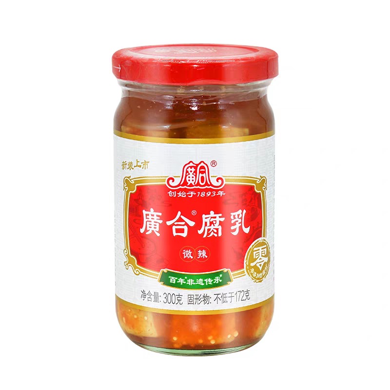 This 300-gram jar contains Spicy Fermented Bean Curd (廣合腐乳), a celebrated traditional Chinese condiment from the renowned Guang He (廣合) brand, which has been in continuous operation since 1893. Fermented bean curd, often called “Chinese cheese,” is made from soft, dried tofu cubes fermented and preserved in brine and seasonings.
